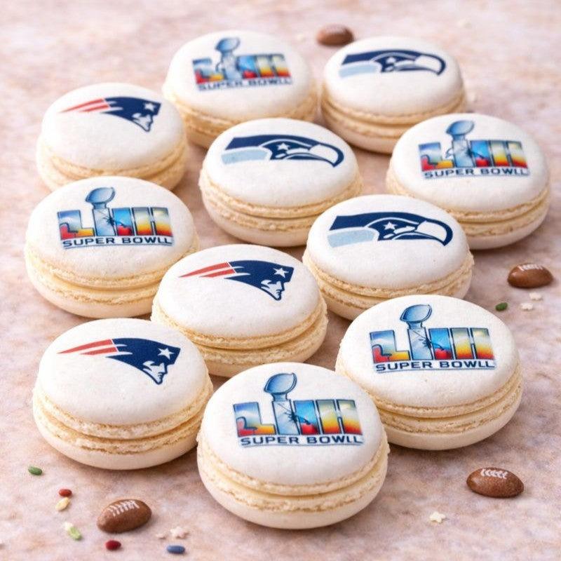 24 Gluten Free French Vanilla Macarons, crafted with crisp shells and smooth, flavorful fillings. Each set features a curated mix of team & game inspired edible print - these macarons are a polished addition to any Big Game spread.